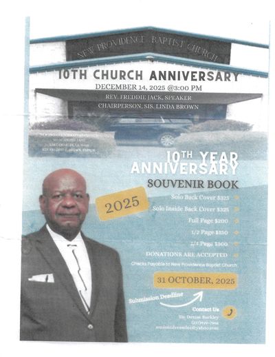 New Providence will celebrate their 10th Year Anniversary on Sunday, December 14, 2025, at 3 PM. The Guest Speaker is President Emeritus Freddie. J. Jack.